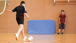 Die Kinder dribbeln durch die Halle und führen an den Hütchen Finten aus. Ein Praxisvorschlag zur Erreichung des Lernziels 2 'Fußballtechniken (kennen)lernen'.