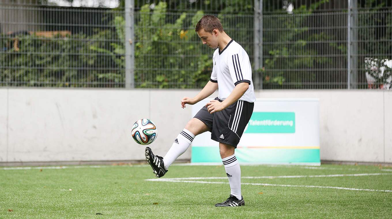 Jongliere einen Ball mit der Fußspitze. Strecke dafür das Bein und ziehe die Fußspitze zum Schienbein hin an, um Deinen Fuß zu fixieren. Versuche nun, den Ball mit der Fußspitze genau zentral von unten zu treffen. Spiele den Ball immer so, dass er gerade nach oben fliegt, damit Du ihn wieder gut von unten spielen kannst.