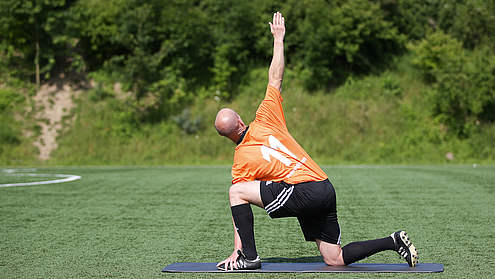 Die Übungen werden beidseitig mit 3 bis 5 Wiederholungen pro Seite durchgeführt. Natürlich kannst du auch mehr Wiederholungen durchführen. Letztlich musst du schauen, wie du dich am besten auf die anstehende Belastung vorbereitet fühlst! Falls du dich abseits des Platzes einmal deiner Beweglichkeit widmen möchtest, kannst du dies dementsprechend auch als eigenständige Einheit absolvieren. Dann solltest du je Seite 6 bis 10 Wiederholungen einplanen und den Durchgang zweimal durchlaufen.