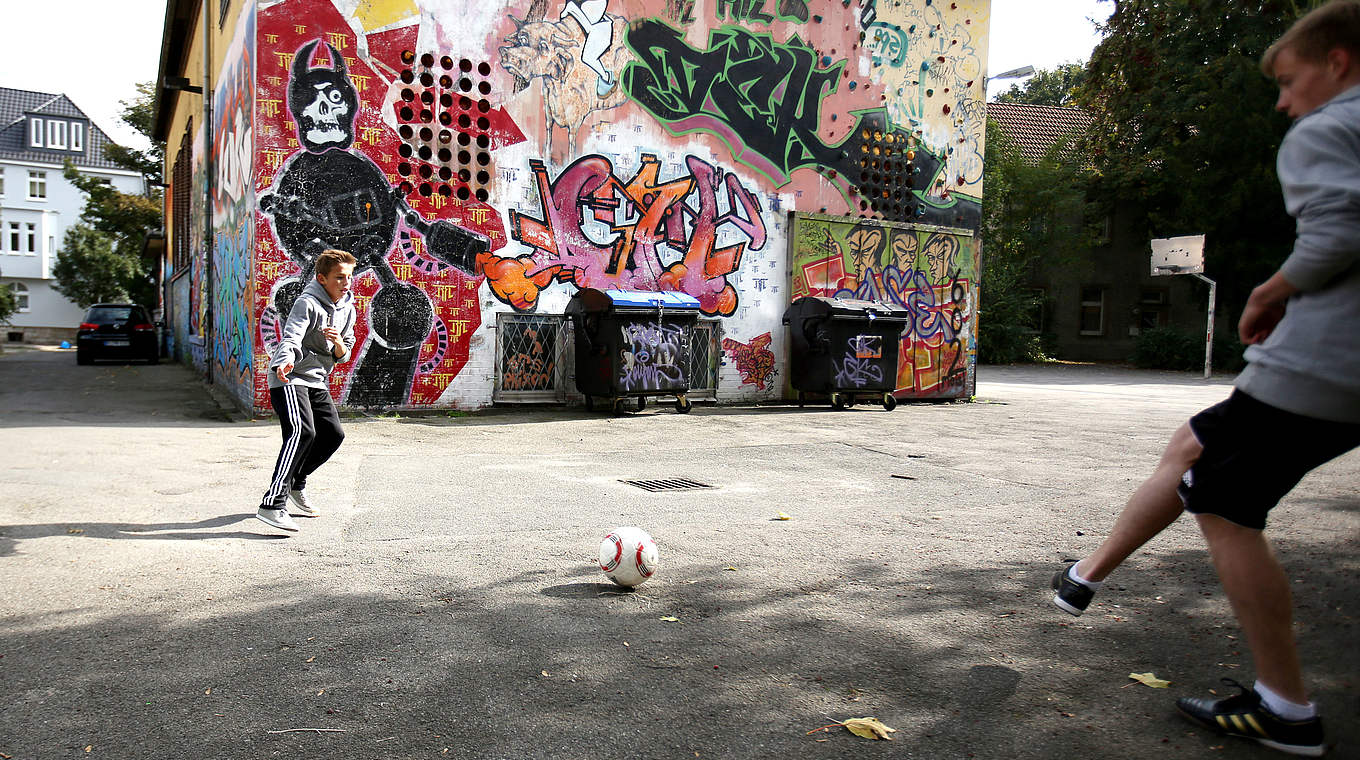 Nehmt den Ball so in einer offenen Spielstellung in die Bewegung mit, dass ihr die Wand und den Mitspieler sehen könnt!