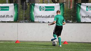 Passe einen Ball direkt mit rechts nacheinander durch drei Hütchentore vor einer Wand. Wechsel am letzten Hütchentor die Richtung und durchspiele die Hütchentore danach mit links usw.