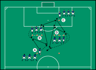 Das Lösen eines Stürmers aus dem Deckungsschatten mit seitlichem Entgegenkommen ist Schwerpunkt dieser Trainingseinheit. Dazu muss das Timing zwischen den Mittelfeldspielern und den Stürmern passen und eingespielt sein. Bereits im Aufwärmen werden das Anbieten und Lösen mit zwei Passübungen eingeübt. In den Hauptteilen werden sowohl der Torschuss als auch ein Verteidiger integriert, so dass spielnahe Abläufe verbessert werden können. Im Schlussspiel werden alle Inhalte wettkampfnah angewendet.