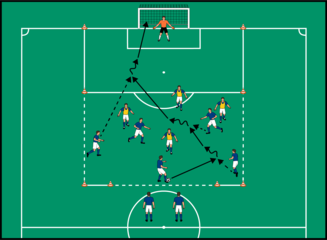 Kommt es im Spiel zu einer Überzahlsituation gegen eine formierte Abwehr, ist es einerseits erforderlich möglichst zielstrebig abzuschließen, andererseits jedoch auch den Ball nicht auf Grund von überhasteten Aktionen unnötig zu verlieren. Letzteres passiert häufig, wenn den Ballbesitzern die nötige Ruhe fehlt. Der richtige Moment und die passende Lücke sind oftmals viel gewinnbringender als der schnelle Abschluss. Grund für ärgerliche Ballverluste ist oftmals auch das falsche taktische Verhalten der Angreifer. Kennen sie die geeigneten Ball- und Laufwege nicht oder greifen zu hastig in einer zu engen Formation an, lässt sich die gegnerische Abwehrreihe nicht geschickt auseinanderziehen. Daher muss das korrekte Angriffsverhalten und das aufeinander abgestimmte Timing der Ballbesitzer in sich stetig wechselnden Überzahlsituationen immer wieder trainiert werden.