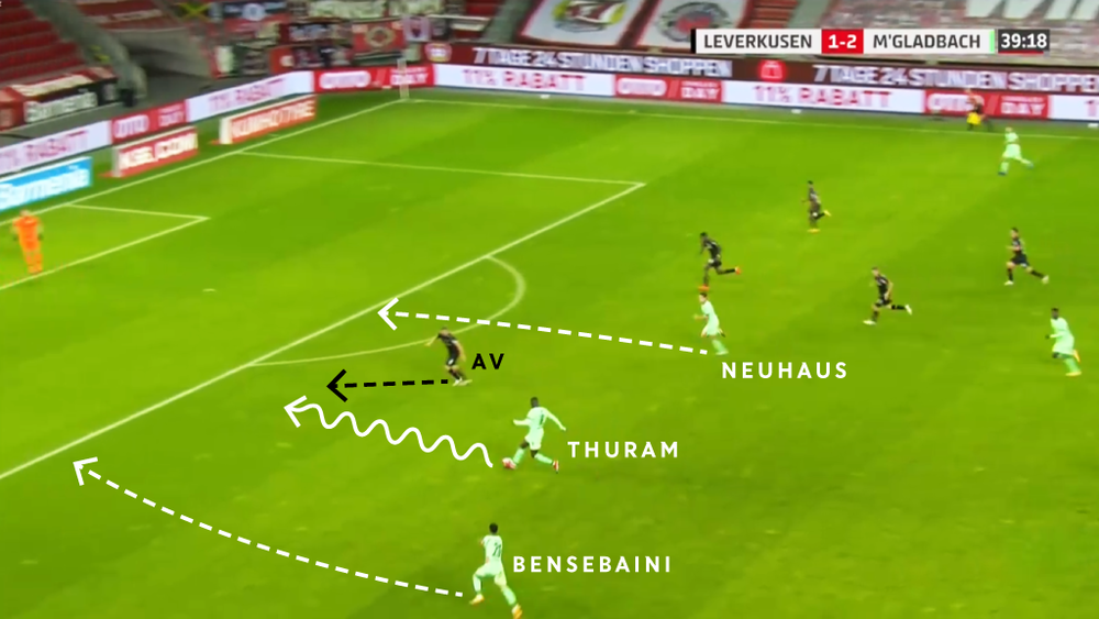Thuram dribbelt zum Tor und bindet den gegnerischen Außenverteidiger (AV). Gleichzeitig laufen Neuhaus und Bensebaini in die Tiefe und attackieren den Raum im Rücken der Abwehr.