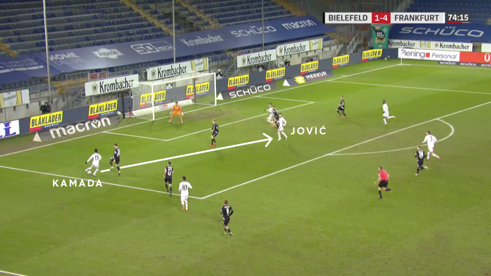 Kamada lässt mit Gegnerdruck im Rücken direkt zu Kostic klatschen. Kamada setzt sich im Anschluss sofort in die Tiefe ab, Kostic dribbelt diagonal zum Strafraum.