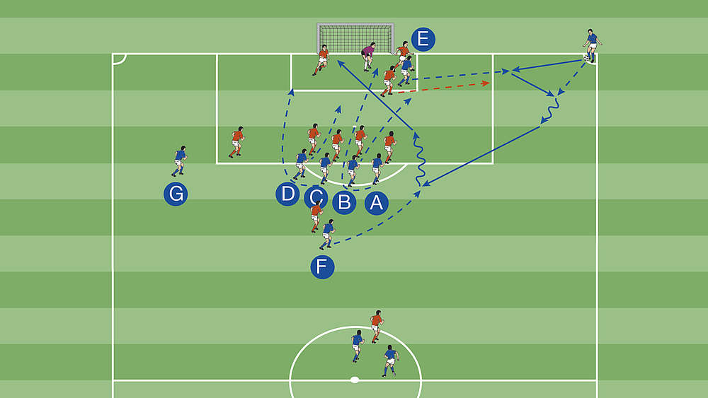 Gegen eine in Raumdeckung agierende Mannschaft sind mit einfachen Hereingaben nur schwer Tore zu erzielen. Die Verteidiger warten geradezu darauf – sie postieren sich sehr tornah im Raum, um in der Vorwärtsbewegung aktiv ‘in den Ball’ starten zu können. Entsprechend gilt es, die weniger bzw. dünner besetzten Räume für gefährliche Aktionen zu nutzen und die Verteidiger gleichzeitig vor dem eigenen Tor zu binden!