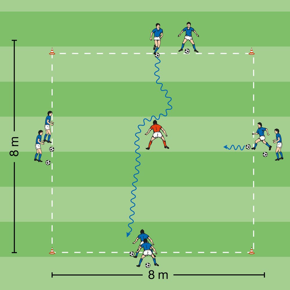 6 Spieler verteilen sich außen um 10 x 10 Meter großes Feld und spielen mit 2 Innenspielern 8 gegen 4.