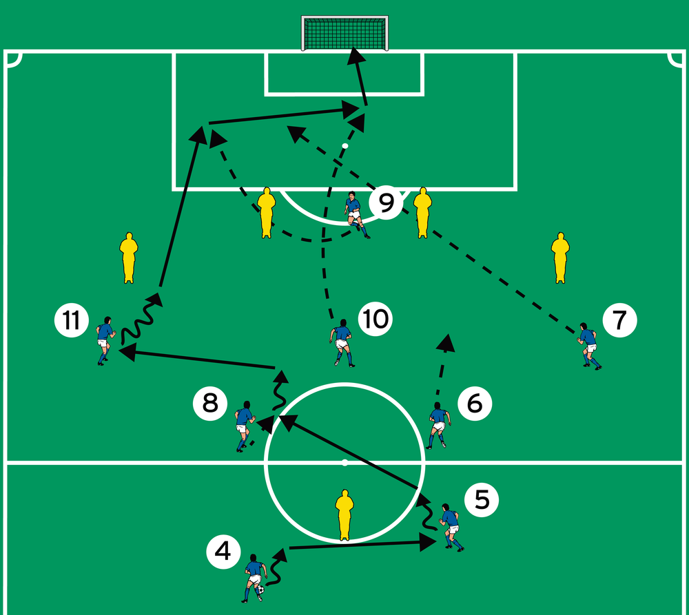 9 spielt ins Zentrum auf eine der drei Positionen, die von 11, 10 und der nachrückenden 7 eingenommen werden.