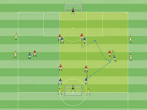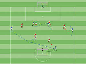 Diese Einheit stellt das Freilaufen und Anbieten in den Vordergrund. Zunächst werden die Möglichkeiten, sich freizulaufen – z. B. Kommen-Gehen sowie Innen-Außen und umgekehrt – aufgezeigt. Die Spieler sollen diese Bewegungen im Aufwärmen positionsspezifisch anwenden. Im weiteren Verlauf kommt dann der Gegnerdruck hinzu, sodass das individuelle Verhalten auf die Gruppe abgestimmt werden muss. Hier arbeiten wir bewusst in Gleichzahlsituationen. Dabei geben wir den Spielern Aufgaben: