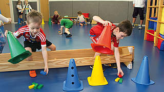 Sobald Bambini einen Ball sehen, wollen sie schießen. Eine Spielstunde, die den Torschuss als Schwerpunkt akzentuiert, motiviert die jüngsten Spieler, die hier mit hoher Wiederholungszahl üben.