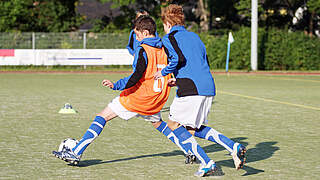 Kleingruppentraining zum Fintieren, Passen und Schießen Aufwärmen: Fintenspiegel / Flotte Passstaffel Hauptteil: Risiko-Torschuss I / Risiko-Torschuss II Schlussteil: Kombi-Spiel