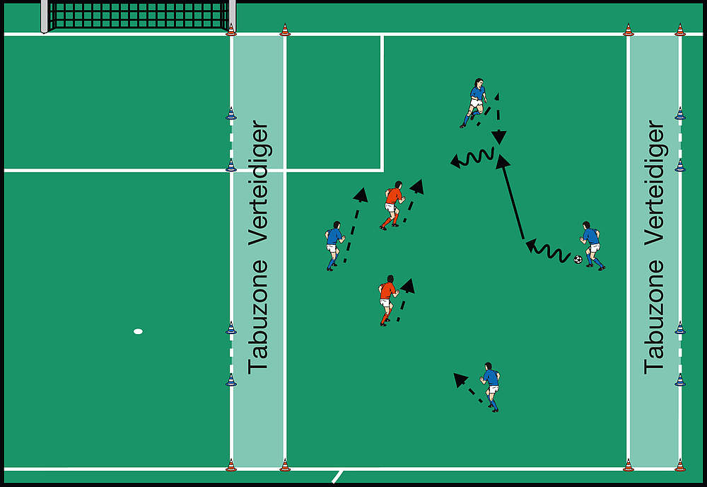 Vor den Toren eine jeweils 2 Meter breite Tabuzone markieren, die von den Abwehrspielern nicht betreten werden darf.