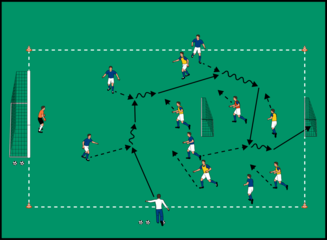 Eine gute Wahrnehmung ist von Kindern nicht nur im Schulalltag gefordert. Auch auf dem Fußballplatz hilft es den Spieler*innen sehr, wenn es ihnen gelingt, Situationen schnell zu erkennen und passende Handlungen schnellstmöglich abzurufen. Die Fähigkeit, auch komplexe Anforderungen schnell und richtig zu erfassen, sollte entsprechend im Trainingsalltag der Kinder eine wichtige Rolle spielen. In dieser Trainingseinheit müssen sie sich in sich stetig wechselnden Räumen zurechtfinden, Hindernissen ausweichen und dabei auch noch auf von unterschiedlichen Seiten ins Feld dribbelnde Mit- und Gegenspieler reagieren. Technische Fertigkeiten wie das Passen und Schießen werden zudem ebenfalls mittrainiert.