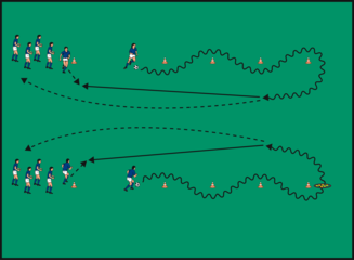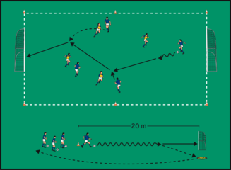 Neben Torschuss-Wettkämpfen eignen sich auch abwechslungsreiche Turnierformen für ein motivierendes Training. Neben den spielerischen Inhalten kann man als Trainer durch zusätzliche Aufgaben dabei technische Schwerpunkte mitschulen. So treten im Hauptteil dieses Trainings mit 12 Spielern jeweils drei Mannschaften gegeneinander an. Zwei Teams spielen gegeneinander, die dritte Mannschaft führt gleichzeitig eine Technikaufgabe zum Dribbling durch. Das Dribbling wurde dabei bereits zuvor im Aufwärmen schwerpunktmäßig vorbereitet.