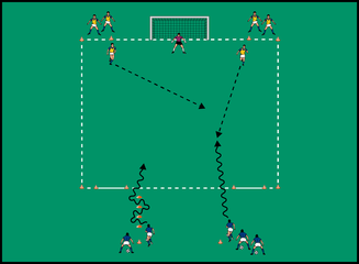 Das Zweikampfverhalten ist Schwerpunkt dieses Trainings mit 12 Spielern. Ziel der Verteidiger ist es, den Ball zu zweit gegen einen Angreifer zu erobern und anschließend selbst anzugreifen. Dabei ist besonders darauf zu achten, dass der Ball mit fairen Mitteln erobert wird. In Überzahl sollte ein Foulspiel oder ein Ausspielen des Balles unbedingt vermieden werden. Wird der Ball zunächst zum Angreifer zugespielt oder gar zugeworfen, bedeutet dies einen Zeitgewinn für die Verteidiger. So lange der Angreifer den Ball nicht kontrolliert, weiter Druck auf den Angreifer ausüben.