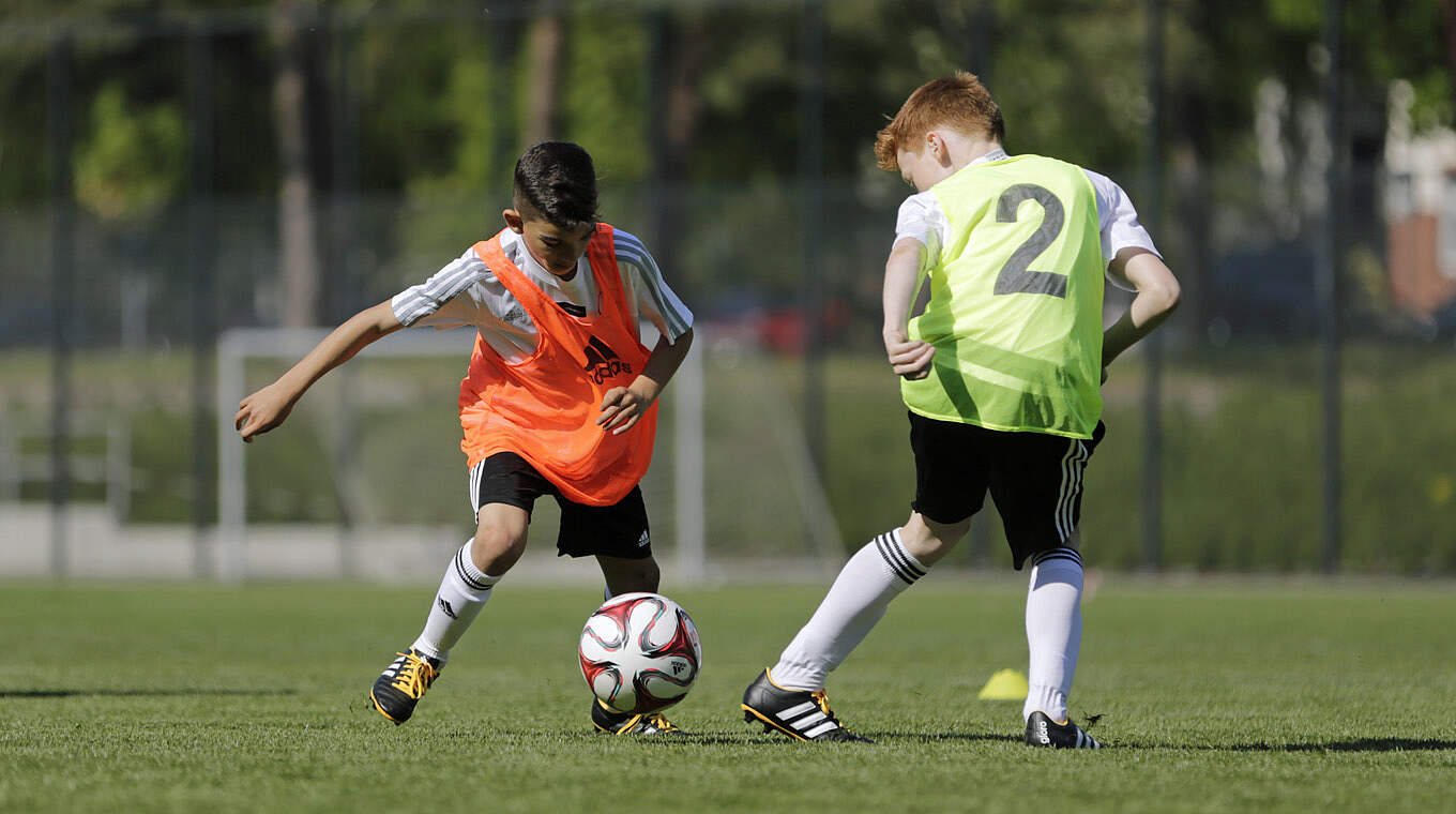 Das Dribbling bildet den Schwerpunkt dieser Trainingseinheit. Dabei sollen die Spieler*innen schon im Aufwärmteil zu einem variablen Dribbling mit beiden Füßen aufgefordert werden. Außerdem als Trainer*in verschiedene Dribbeltechniken vorgeben und die Spieler*innen mit der Fußinnen-/-außenseite, dem Spann und der Sohle dribbeln lassen. Dabei die Dribbelwege immer wieder variieren, um die Konzentration zu fordern. Im Hauptteil wenden die Spieler*innen das variable Dribbling in unterschiedlichen 1-gegen-1-Situationen an. Dabei sollen sie möglichst frei ausprobieren können und bei jedem Angriff den Abschluss suchen.