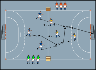 Die Halle eignet sich optimal für ein Torschusstraining. Da verschossene Bälle von der Hallenwand zurückprallen und nicht weit wegrollen können, erhöht sich die Anzahl möglicher Torschüsse für jede*n Spieler*in deutlich. Ein weiterer Vorteil der Halle ist, dass sich verschiedene Hallengeräte (z.B. Kleinkästen, Kastenoberteile, Matten usw.) als Tore nutzen lassen: Präzision ist beispielsweise gefragt, wenn die Spieler*innen auf Kleinkästen passen müssen, Kastenoberteile oder gekippte Langbänke erfordern flache Schüsse und Weichbodenmatten stellen mit ihren Maßen schon fast reguläre Tore dar. Falls zudem auch normale Tore zur Verfügung stehen, erfreuen sich die Spieler*innen am abwechslungsreichen Torschusstraining.