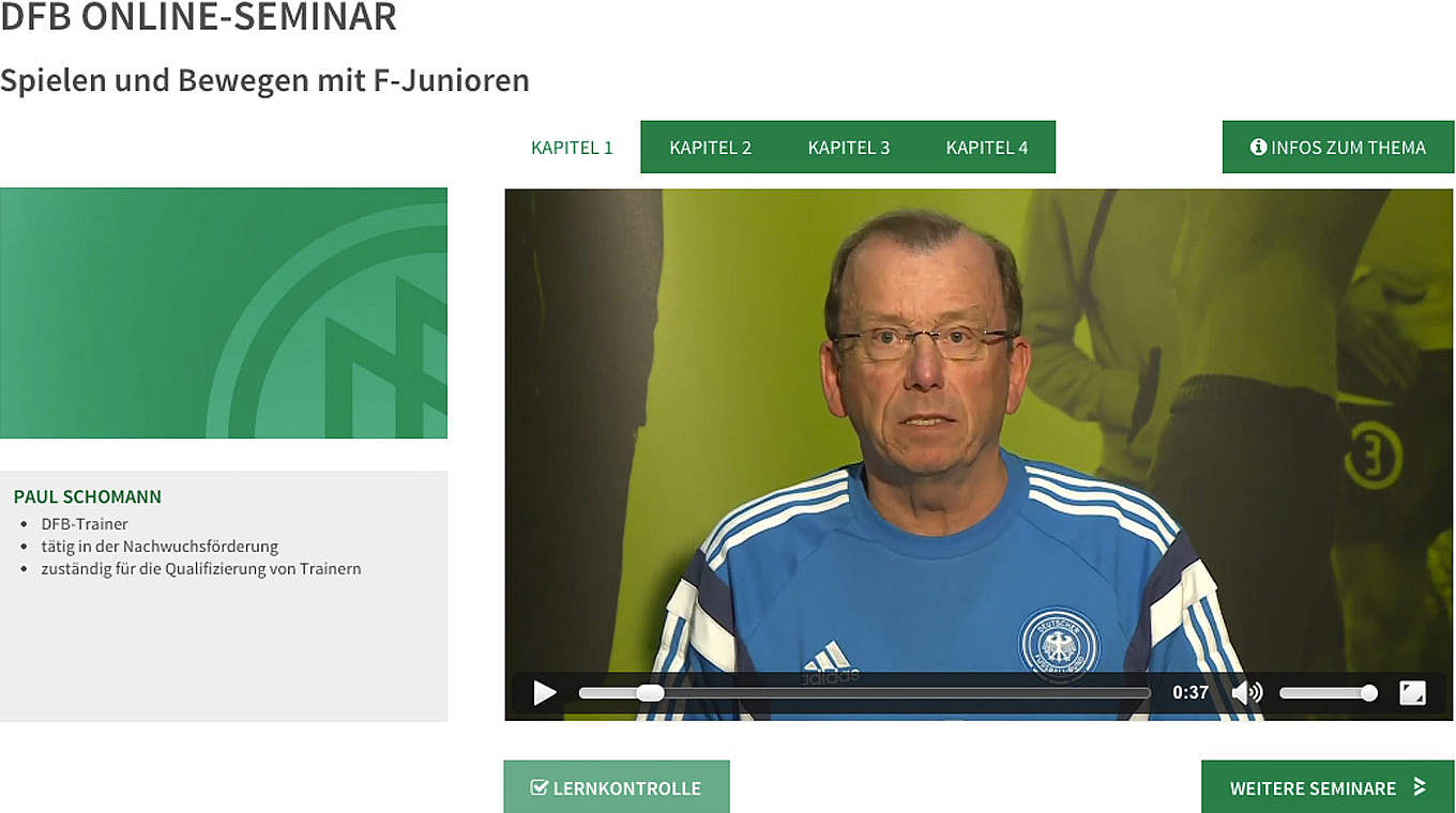 Die DFB-Online-Seminare sind kostenlos und frei zugänglich. Trainer und Vereinsmitarbeiter erhalten hier in Form von virtuellen Präsentationen Tipps und Anregungen von DFB-Experten für ihre tägliche Arbeit im Amateurverein. Neu ist das responsive Design, mit dem die Online-Seminare jetzt auch unterwegs auf Tablets und Smartphones angesehen werden können.