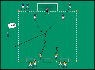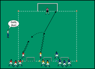 Neben allen Angriffstechniken ist es auch wichtig, immer wieder das Abwehrspiel zu schulen. Ziel der Verteidiger soll stets der Ballgewinn sein. Ein einfaches Ausspielen des Balles reicht nicht aus. Als Verteidiger den Ballführenden anlaufen, in schräger Position aktionsbereit stellen und den Ball angreifen, sobald dieser kurzzeitig ‘frei’ ist. Bei Ballgewinn ein schnelles Umschalten fordern und die Verteidiger mit der Angriffsmöglichkeit auf mehrere Minitore belohnen. Stehen keine Minitore zur Verfügung, Stangen- oder Hütchentore nutzen. Spielfelder eher größer markieren, um Zweikämpfe zu ermöglichen und ein zu schnelles Ausspielen der Bälle zu vermeiden. Die Verteidiger auch mal in Überzahl agieren lassen, wobei ein Spieler Druck auf den Ballführenden ausübt und der andere Verteidiger sichert. Im Aufwärmen können die Spieler bereits auf typische Verteidigerbewegungen wie Rückwärts- und Seitwärtsläufe sowie den Körperkontakt mit dem Gegner vorbereitet werden.