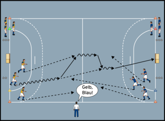 Zum Start der Hallensaison sollten sich die Spieler*innen zunächst durch kleine Spiele an die Gegebenheiten der Halle gewöhnen. Hallengeräte wie Kleinkästen können als Minitore genutzt werden. Die Markierungen auf dem Hallenboden dienen als Dribbelwege oder Spielfeldbegrenzungen. Die Hallenwände als Banden in die Spiel- und Übungsformen einbeziehen. Dieses Training mit zwölf Spieler*innen findet in einer kleinen Halle statt. Die vorgeschlagenen Spielfeldmaße dem Könnensstand der Spieler*innen und den Gegebenheiten der verfügbaren Halle stets anzupassen und gegebenenfalls zu verändern.