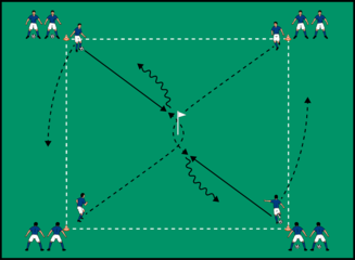 Die Ballan- und -mitnahme stets zuerst ohne Gegner einüben, dann aber auch gegen einen Gegenspieler anwenden. Ein Fangspiel zum Aufwärmen erzeugt direkt Gegnerdruck. Im Hauptteil die Ballkontrolle mit einem Torschuss verbinden. Dabei sollen die Spieler schnell mit möglichst wenigen Kontakten zielgenau abschließen. Den Spieler am Ball bei der Ballmitnahme durch einen nachrückenden Spieler zunächst unter Zeitdruck, später durch einen Verteidiger auch unter Gegnerdruck setzen. Im Schlussteil den Aufbau für ein Spiel mit drei Mannschaften nutzen und durch Zuspieler viele Ballan- und -mitnahmen im Spiel provozieren.