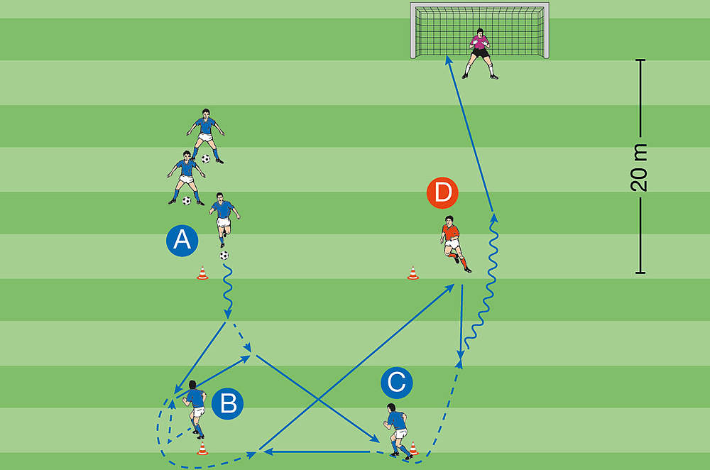 Nachdem die Spieler in der Basisübung den Ablauf kennengelernt haben, kommt bei den folgenden drei Variationen der Torabschluss hinzu. Somit wird außerdem verdeutlicht, wozu sich ein Direktpassspiel im Besonderen anbietet: zum Herausspielen von Torchancen!