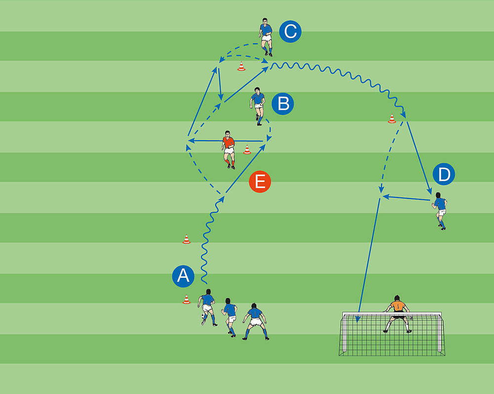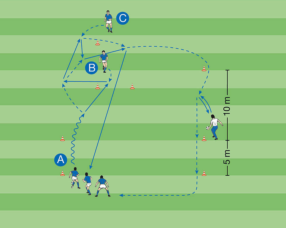 Doch bevor sich die Spieler mit dem Zusammenwirken in der komplexen Spielsituation befassen sollten, müssen die Grundlagen perfekt sitzen. Dabei werden das Passen, das Anbieten und Freilaufen sowie die An- und Mitnahme in einem Ablauf miteinander kombiniert. In Rundläufen lässt sich der Ablauf beliebig oft durchführen, so dass viele Wiederholungen der geforderten Bewegungen garantiert sind.